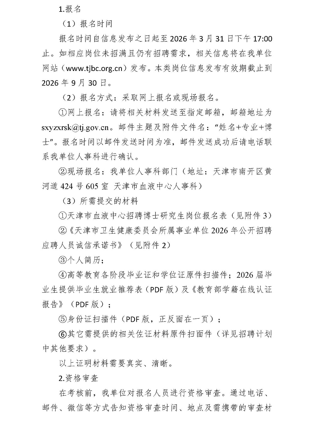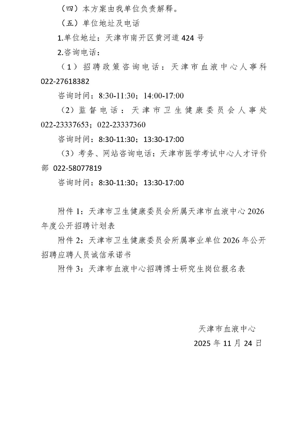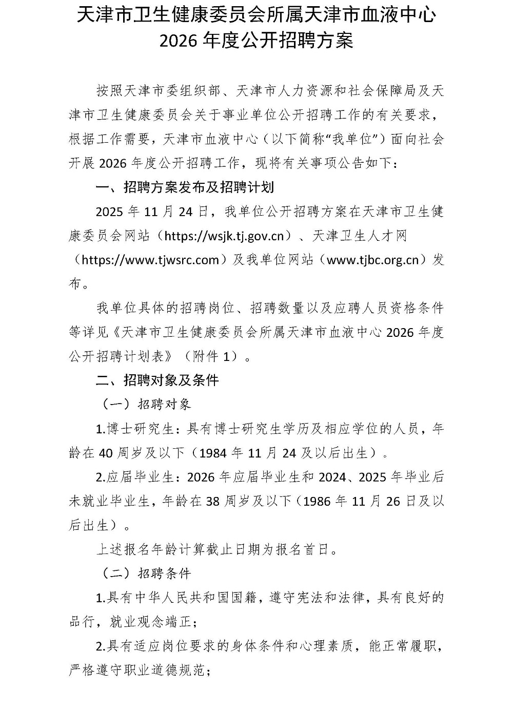 附件1:天津市卫生健康委员会所属天津市血液中心2026年度公开招聘计划表